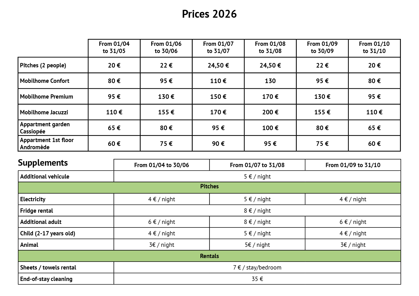 The campsite will be closed from October 31, 2025, to April 1, 2026. For any accommodation booking requests during this period, please contact us by email or by phone at +33 7 49 82 29 41.